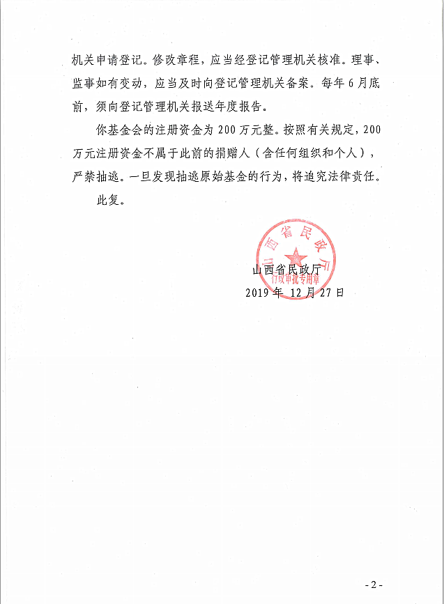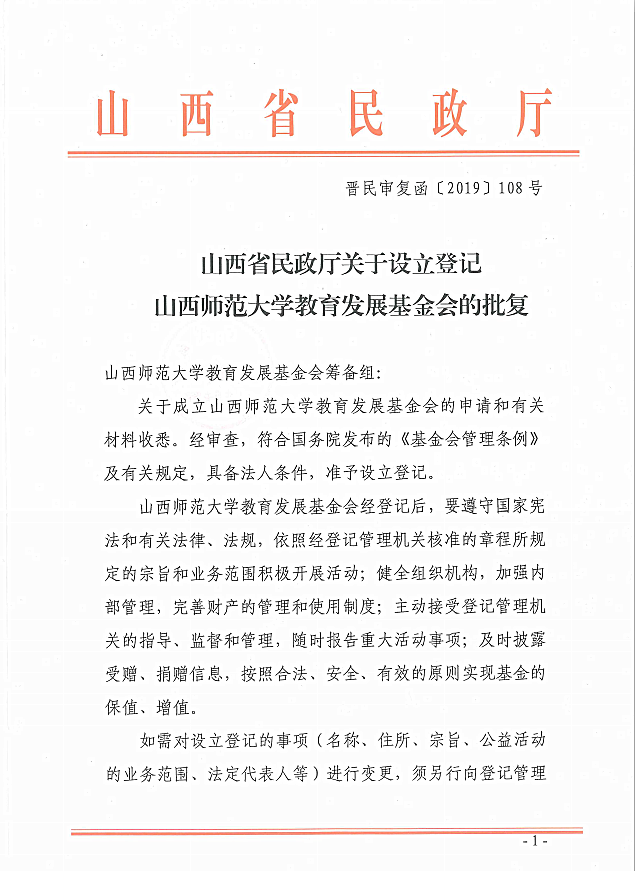 2019年12月27日,山西省民政厅正式向我校教育发展基金会筹备组复函(晋民审复函[2019]108号),批准山西师范大学教育发展基金会正式成立,并核发了基金会法人登记证书。