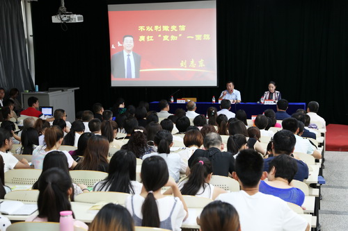 山西省第六届诚实守信道德模范刘志东和他的女儿临汾市尧都区五一劳动奖章获得者刘晋晶分别为在场师生作了报告。在两个多小时的报告会中,刘晋晶以“承家风 善做人——做老实人、做诚实人、做善良人”为题,用朴实的语言讲述了父亲感人至深的事迹。道德模范刘志东在“不以利微失信,肩扛‘良知’一面旗”的主题报告中,与在场师生一同分享了他的人生经历,讲述了自己的成长史与创业史。他认为,做为儿子,就是要孝敬父母,以孝为先;做为一名共产党员、一名老兵、一名企业家就是要对党和国家忠诚,为政府分忧,为社会解难;做为一位长者,他希望青年学子们要有理想、有信仰,诚信做人,踏实做事,学好本领,报效祖国。