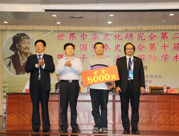 “中华文渊奖”由马来西亚拿督斯里陈荣立局绅倡导并资助设立。本次活动评委会由清华大学教授李学勤、廖明春,中国先秦史学会副会长兼任秘书长宫长为等权威专家组成。经匿名评审,综合打分后决出一等奖一名,二等奖二名,三等奖三名,优秀奖若干。总会创会主席陈荣立、邯郸市政协副主席赵浩军、总会新任主席赵汉青分别向冯俊老师颁发了获奖证书、奖杯及奖金。(政法学院 供稿)