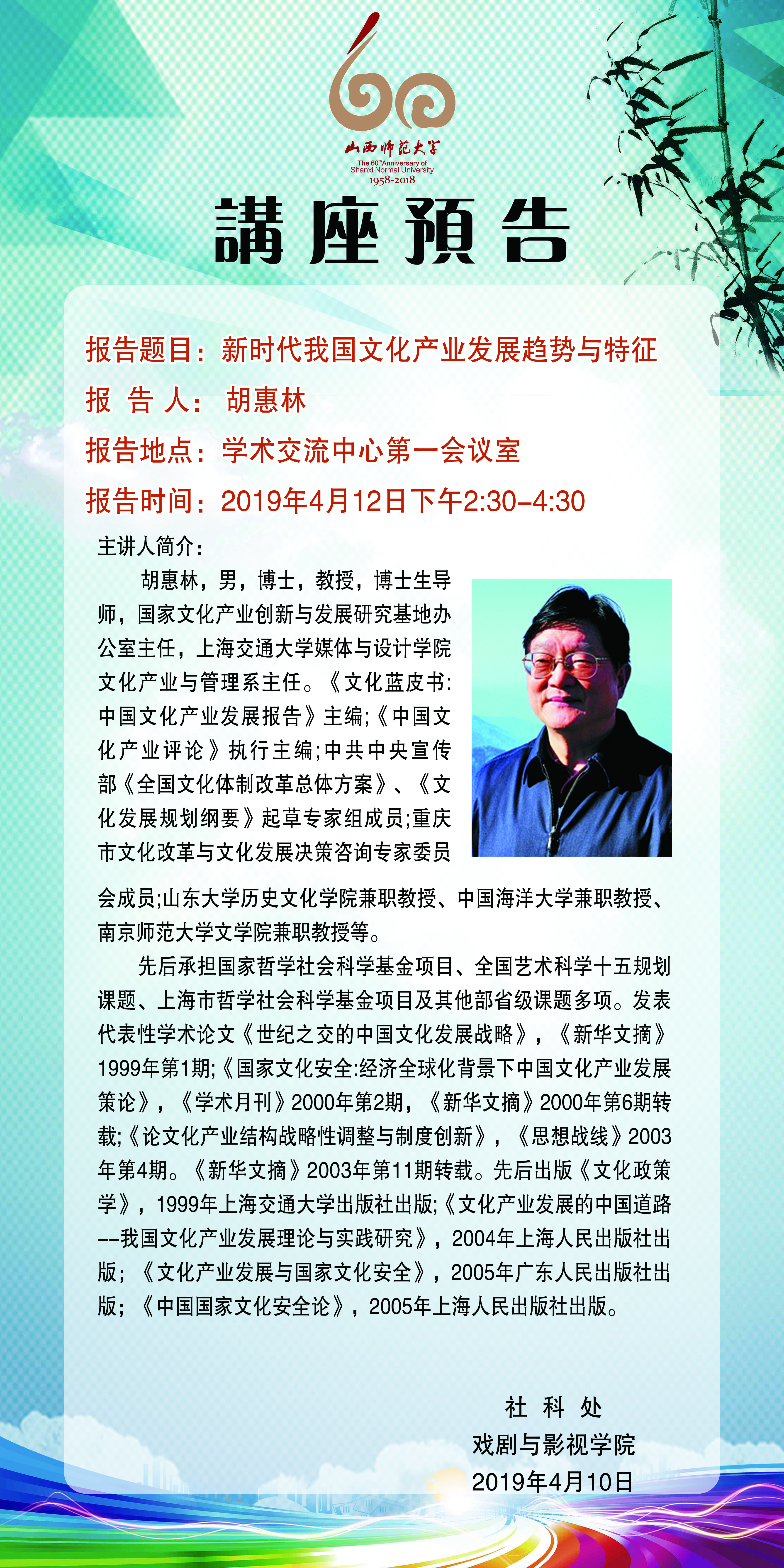 【预告】 国家文化产业创新与发展研究基地办公室主任胡惠林教授应戏剧与影视学院邀请来我校作学术报告