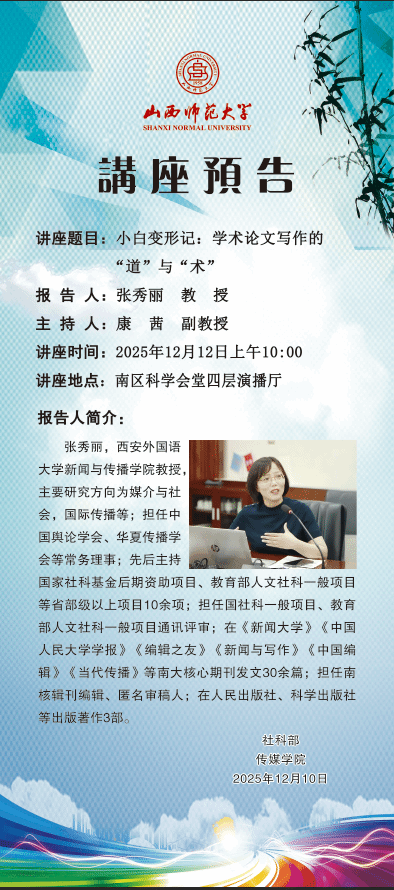 【预告】西安外国语大学新闻与传播学院张秀丽教授应传媒学院邀请作学术讲座