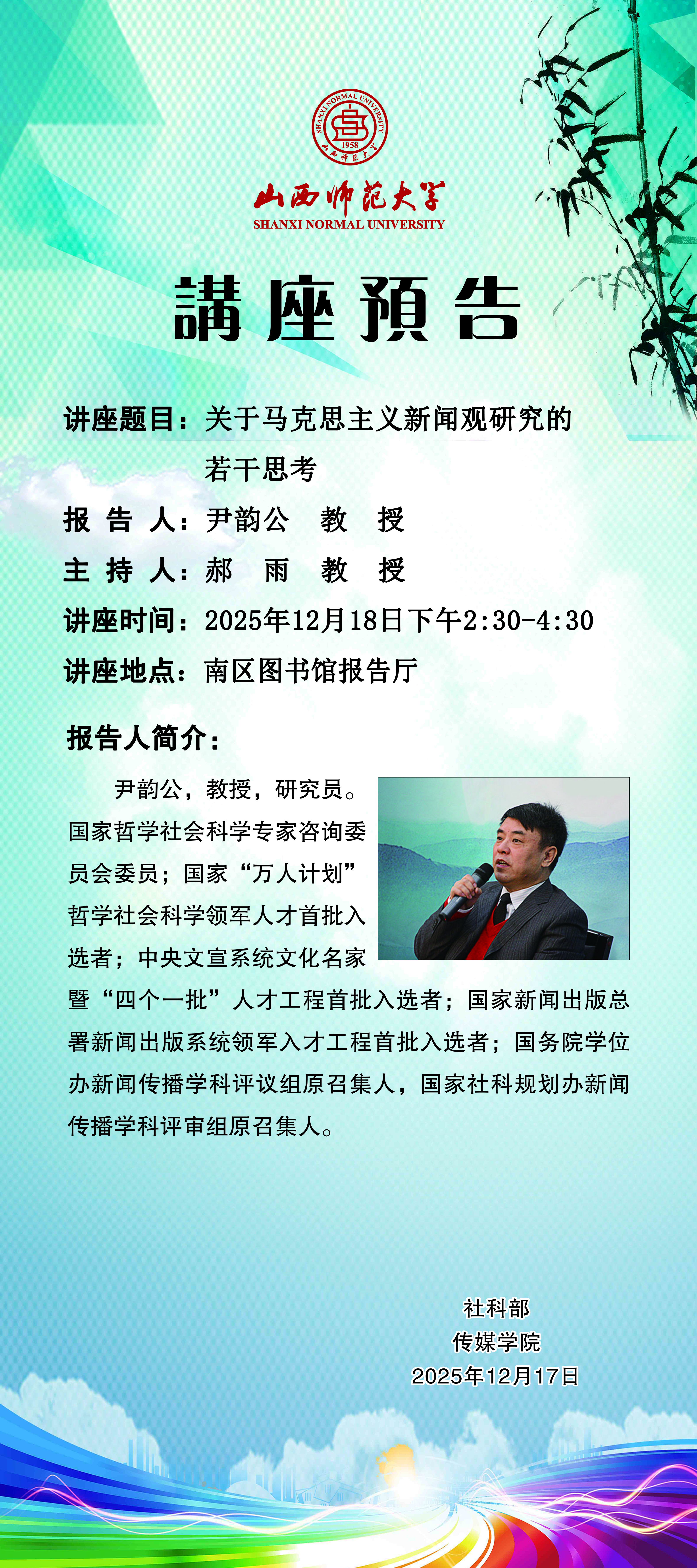 【预告】中国社会科学院研究员尹韵公教授应传媒学院邀请作学术讲座