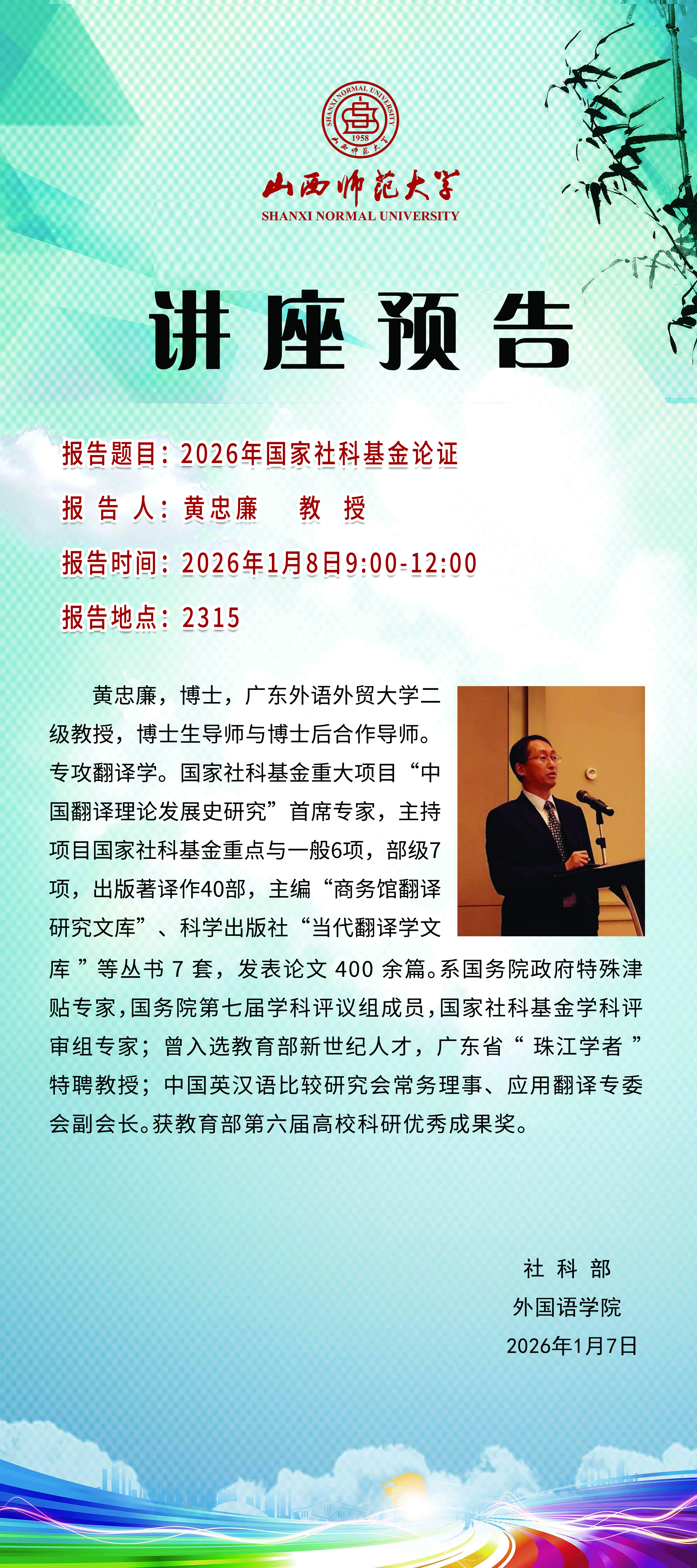 【预告】广东外语外贸大学黄忠廉教授应外国语学院邀请作学术报告