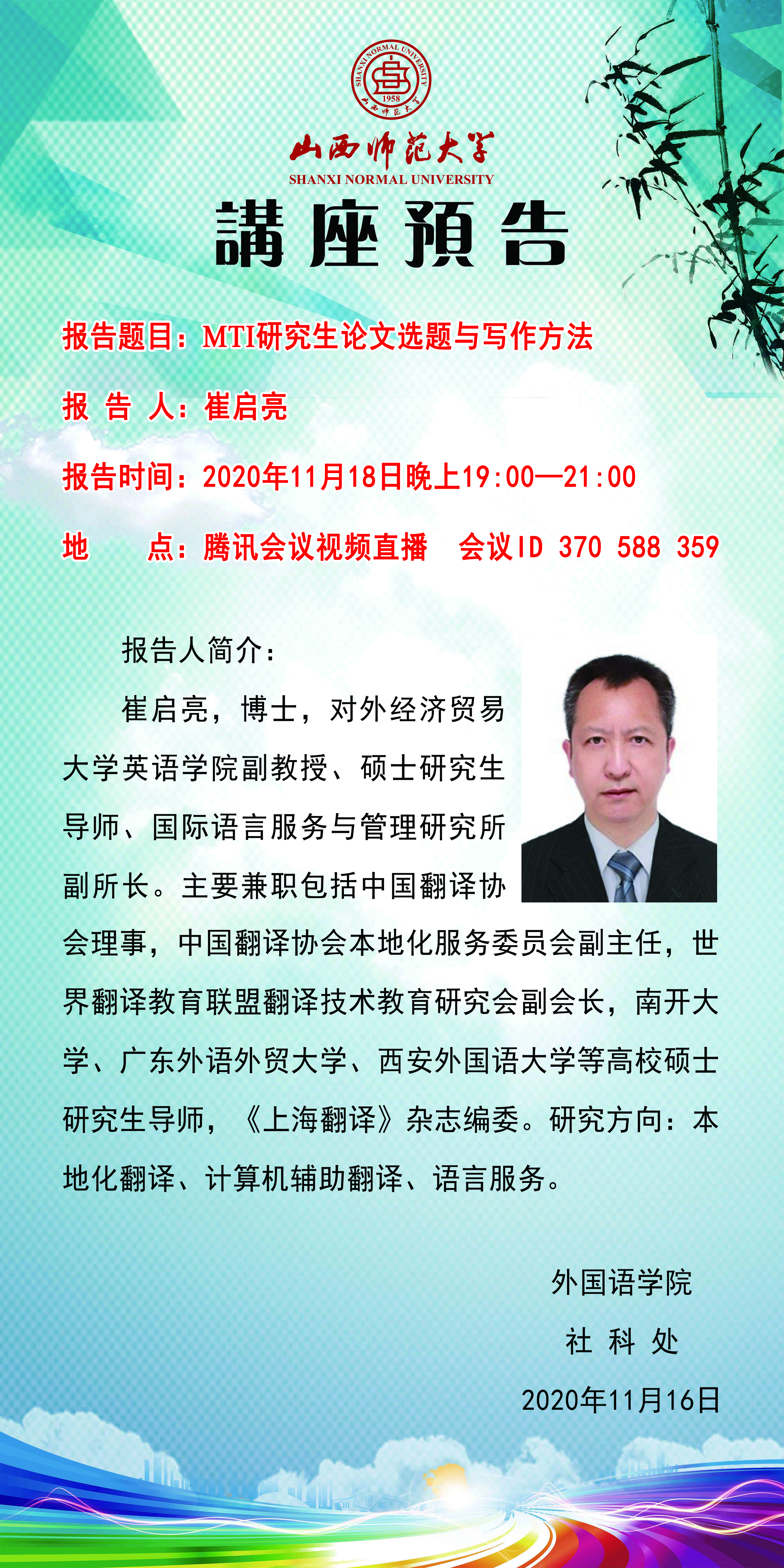 【预告】 对外经济贸易大学崔启亮副教授应外国语学院邀请作线上学术报告
