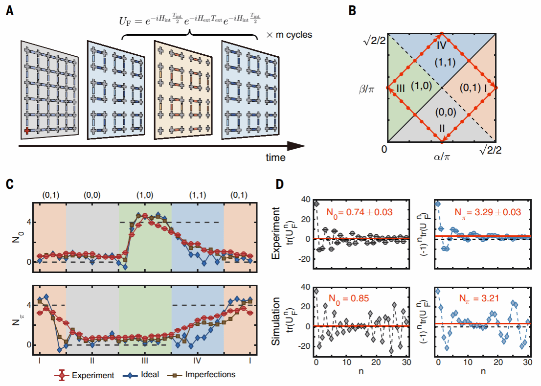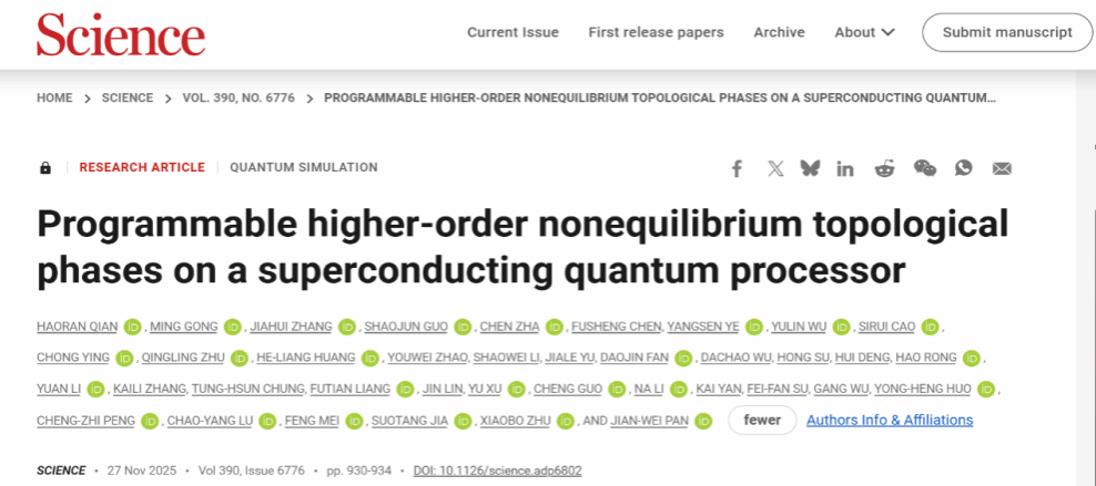 该研究由山西大学与中国科学技术大学合作,中国科学技术大学钱浩然、龚明,山西大学张佳辉(现为我校物理与电子工程学院教师),中国科学技术大学郭少俊为论文共同第一作者,在国际上首次实现并探测了高阶非平衡拓扑物态。相关论文以“Programmable Higher-Order Nonequilibrium Topological Phases on a Superconducting Quantum Processor”为题于11月28日发表在国际顶级学术期刊Science。山西大学梅锋教授,中国科学技术大学朱晓波教授、潘建伟教授为共同通讯作者;主要合作者还包括山西大学贾锁堂教授、中国科学技术大学陆朝阳教授以及中国科学技术大学的其他合作者。该工作标志着量子模拟在探索高阶拓扑和非平衡物态方面取得了重要突破,为下一步利用可编程量子信息处理器在非平衡强关联拓扑物态以及在量子模拟中实现量子优势奠定了关键基础。